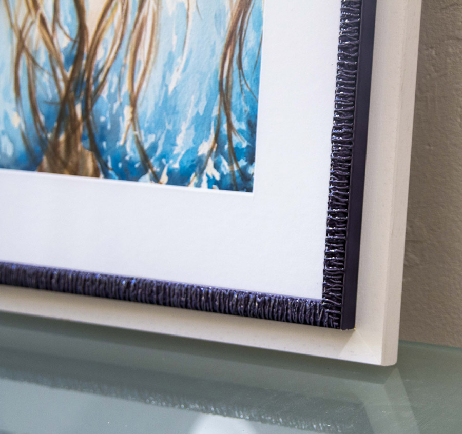 Encadrement sous verre, avec une baguette atypique blanche et bleue, et un passe-partout blanc, une mise en valeur très élégante.