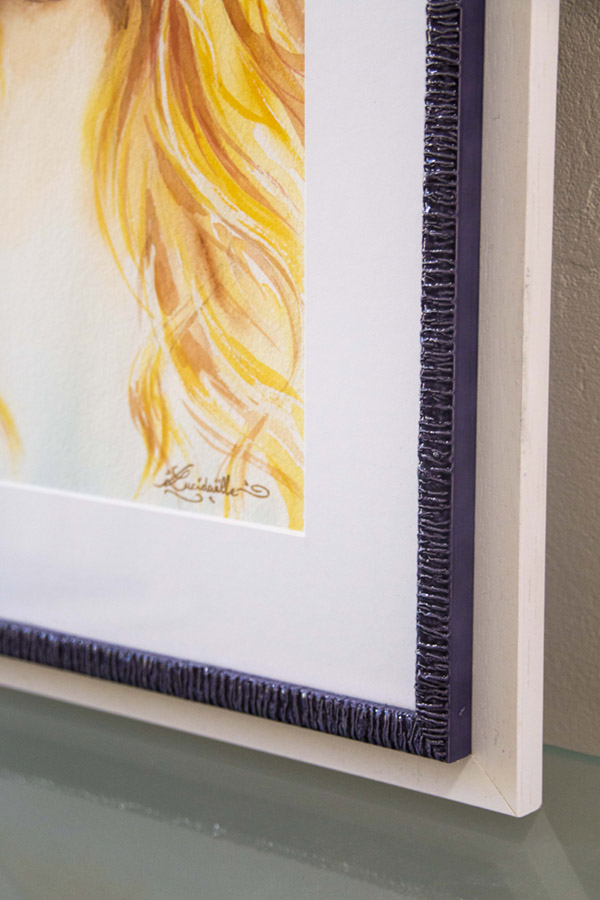 Encadrement sous verre, avec une baguette atypique blanche et bleue, et un passe-partout blanc, une mise en valeur très élégante.