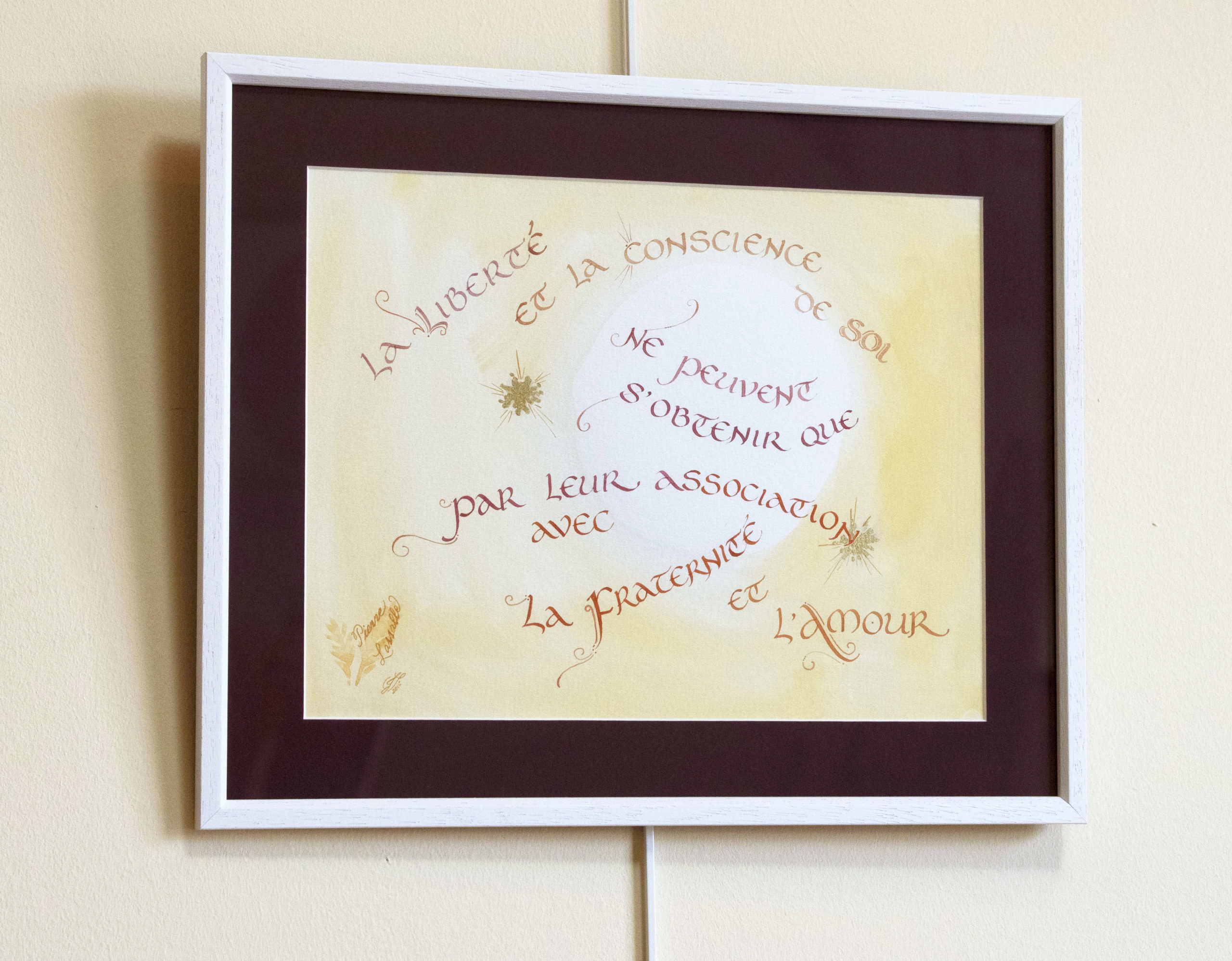 Citation de Pierre Lassalle Liberté & Conscience, calligraphiée par Jane Sullivan. Union de la Liberté et de l’Amour.