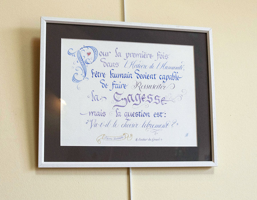 Citation de Pierre Lassalle Ressusciter la Sagesse, calligraphiée par Jane Sullivan. Hommage à la Grande Sagesse.