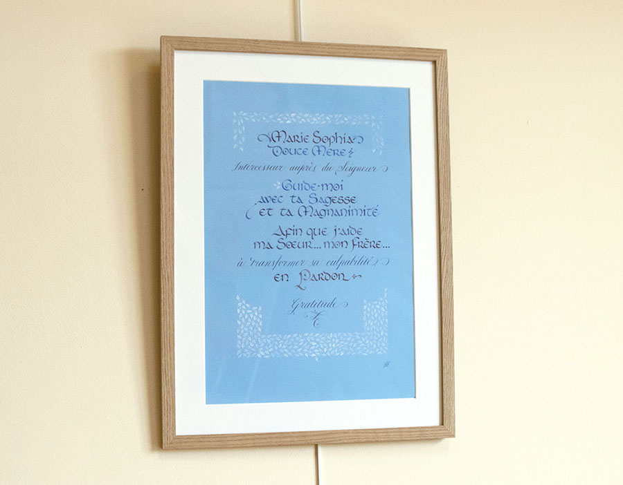 Calligraphie originale encadrée de Prière à Marie Intercesseur, de Pierre Lassalle et Jane Sullivan.