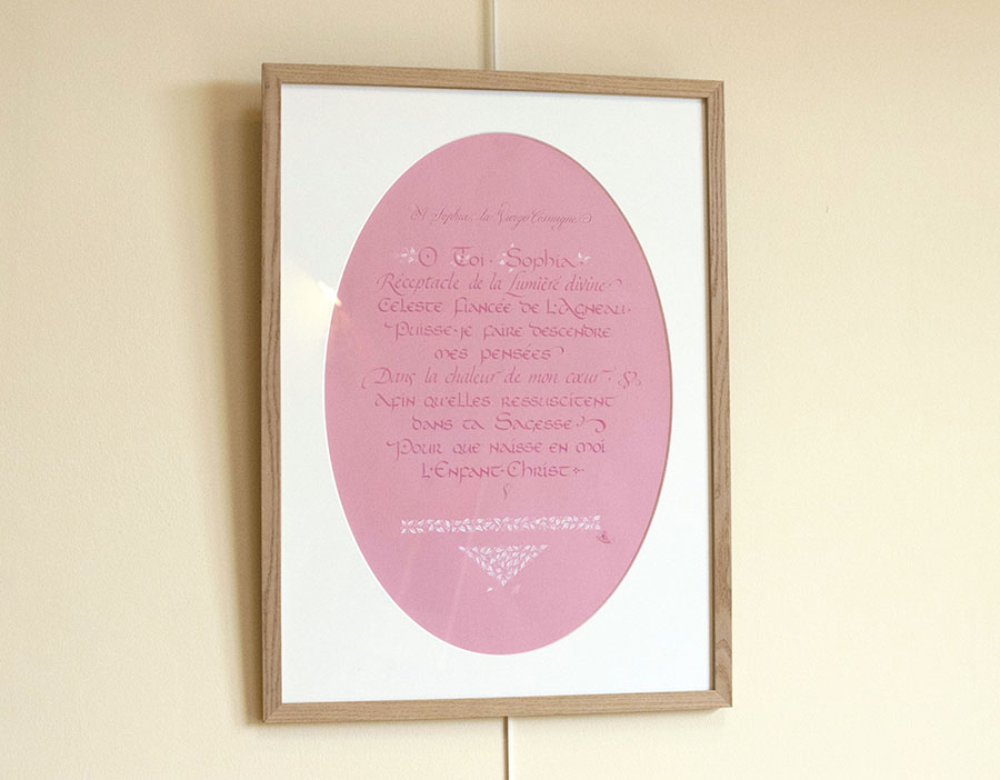 Calligraphie originale encadrée de Prière à Sophia, de Pierre Lassalle et Jane Sullivan.