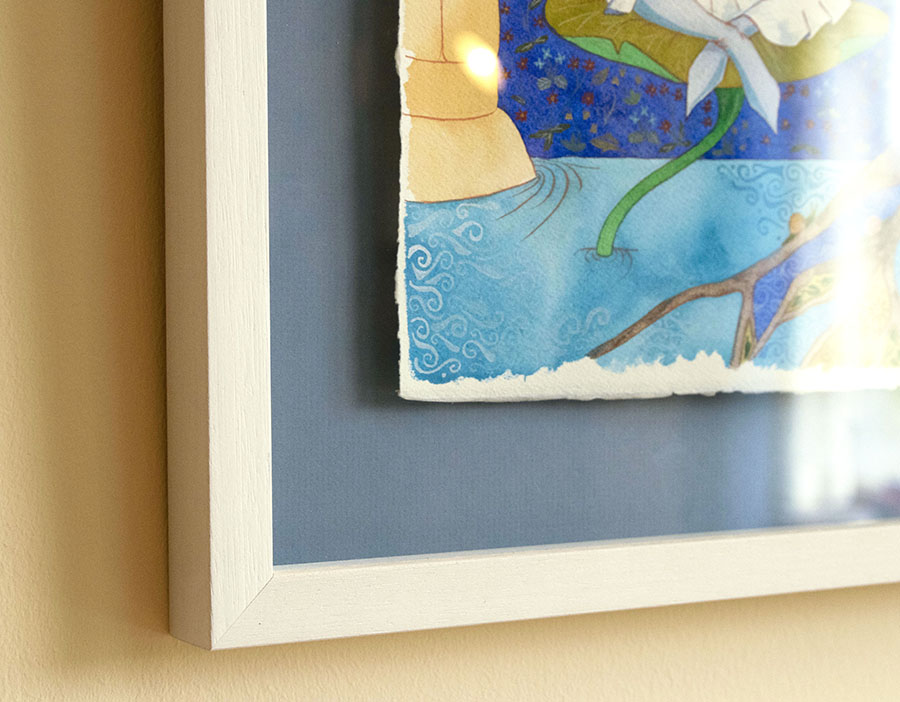 Encadrement flottant sous verre est la meilleure mise en valeur pour cette calligraphie : l'œuvre, dont les bords sont frangés, est surélevé sur un fond bleu, le cadre l'entoure d'une baguette en bois de couleur blanche.