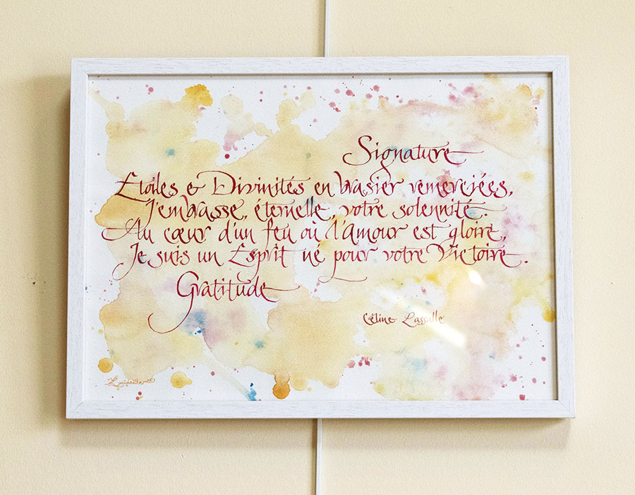 Quatrain poétique de Céline Lassalle, calligraphié par Lucidaëlle. Un style poétique embrassant et engagé, sceau d’Amour vibrant envers la Divinité. Mariage parfait avec l’harmonie des couleurs et l’originalité des tracés qui éclairent la force de la Gratitude.
